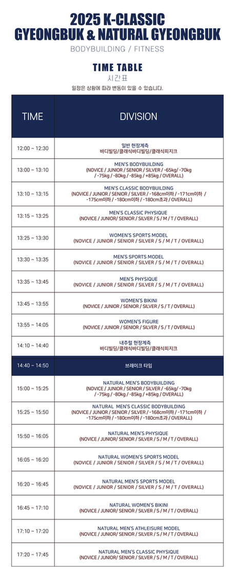 바디빌딩, 클래식 바디빌딩, 클래식피지크 종목 오픈체급을 제외한 모든 종목은 영상계측을 진행해주셔야 합니다.